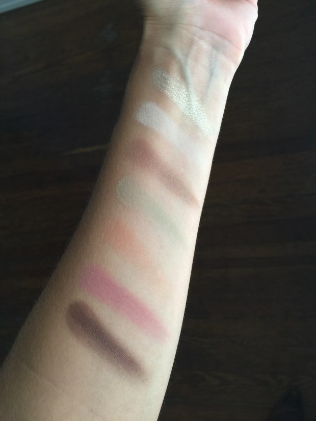 So first you can see that we have a banana powder, a highlight, a blush, and a bronzer. The setting powder is a medium yellow shade. It probably wouldn’t work for super-fair skin tones, but for medium or tan skin tones it works quite well. It’s very finely milled and feels creamy and buttery. It sets concealer very nicely. The bronzer is the same formula–finely milled and creamy. It is a very warm shade, so it is best to use as a true bronzer rather than a contour. The blush is a gorgeous peachy pink, not to cool, not too warm. It would look good on many skin tones. Finally, the highlight. It is noticeable but subtle, more on the cool side, with hints of pink and peach. I have all the shades swatched below:
