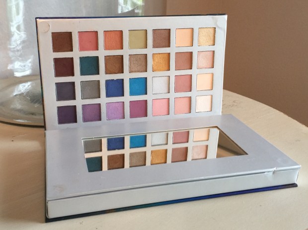 This is Ulta’s Hello Beautiful Deluxe palette: a full-face palette for Summer 2016. I got it last May as a free giveaway with an Ulta purchase. (I bought their eyebrow tint and lip primer to get it, in case you’re wondering. I plan to do a brand review of Ulta products soon and talk about those there. They’re both amazing.) This palette contains 28 eyeshadows on one side, then on the other, it has a banana setting powder, a highlight, a blush, and a bronzer, as well as a lip gloss, a matte lip cream, an eyeliner, a blush brush, and a sponge-tip applicator. The brush and applicator are pretty much useless; I only keep them because for some reason it would annoy me to have empty slots in the palette. Everything else, though, is fantastic. I’ll go through each group of products separately.