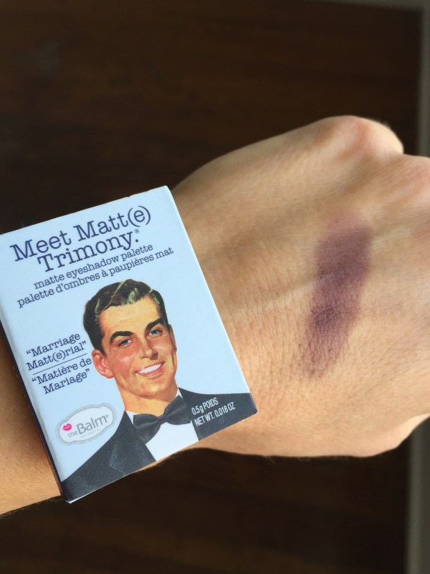 The next item in my Ipsy bag was a single eyeshadow from the Balm’s (Does anyone else always type “the blam” when trying to write this brand name?) Meet Matt(e) Trimony palette, the third in their series of Meet Matt(e) eyeshadow palettes. These palettes each contain 9 matte eyeshadows, and this installment is all warm pink, brown, and rose tones. I received the shade Matt Moskowitz, a deep plum. I’ve had my eye on this palette for awhile, and almost bought it a month ago when it was on an Ipsy sale for $20 (it usually retails for $42). I decided against it, though, because I just felt I’d bought too much makeup lately and wanted to make sure I had a chance to use it before adding new products.
