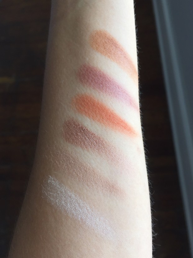 Here are swatches of all of the shadows, top and bottom rows (no primer):