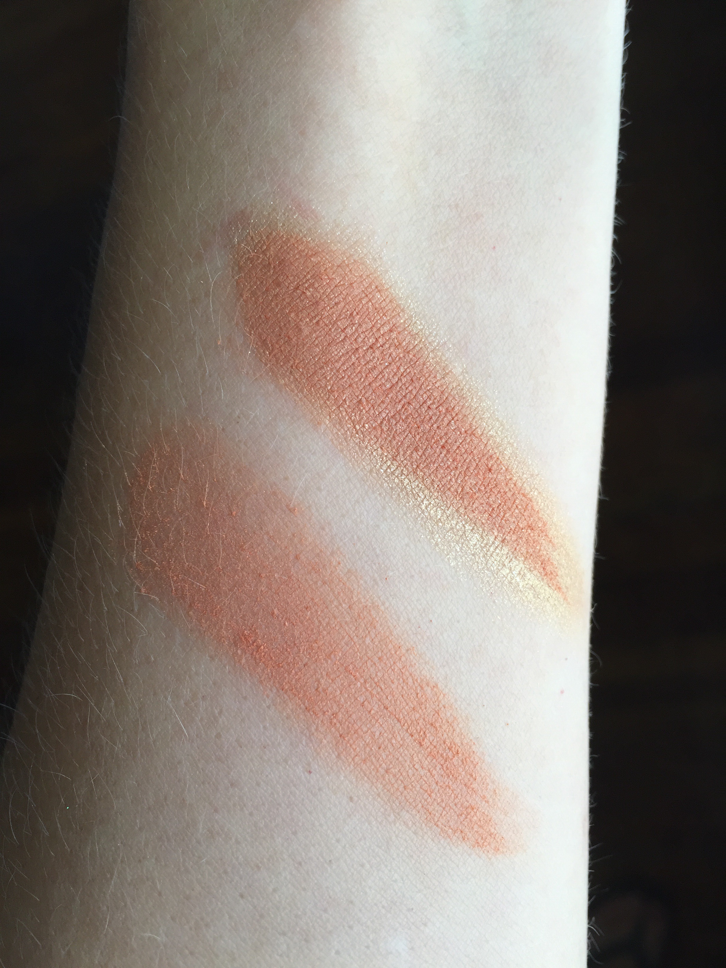 I also discovered a bit of a hack for this palette. When I ordered it, I also ordered my first Maybelline Color Tattoo eyeshadows, in Bold Gold and Bad to the Bronze. I was obviously in a warm shadow frame of mind. One morning as I was getting ready to use the palette, I tried using the Color Tattoo in Bold Gold as a lid base. It looked gorgeous under Arizona, a mid-toned matte orange in the palette. It didn’t add too much shimmer, but it really upped the intensity and warmth of the shade. Here a photo of Arizona: it is swatched alone on the bottom, then over Bold Gold on the top.